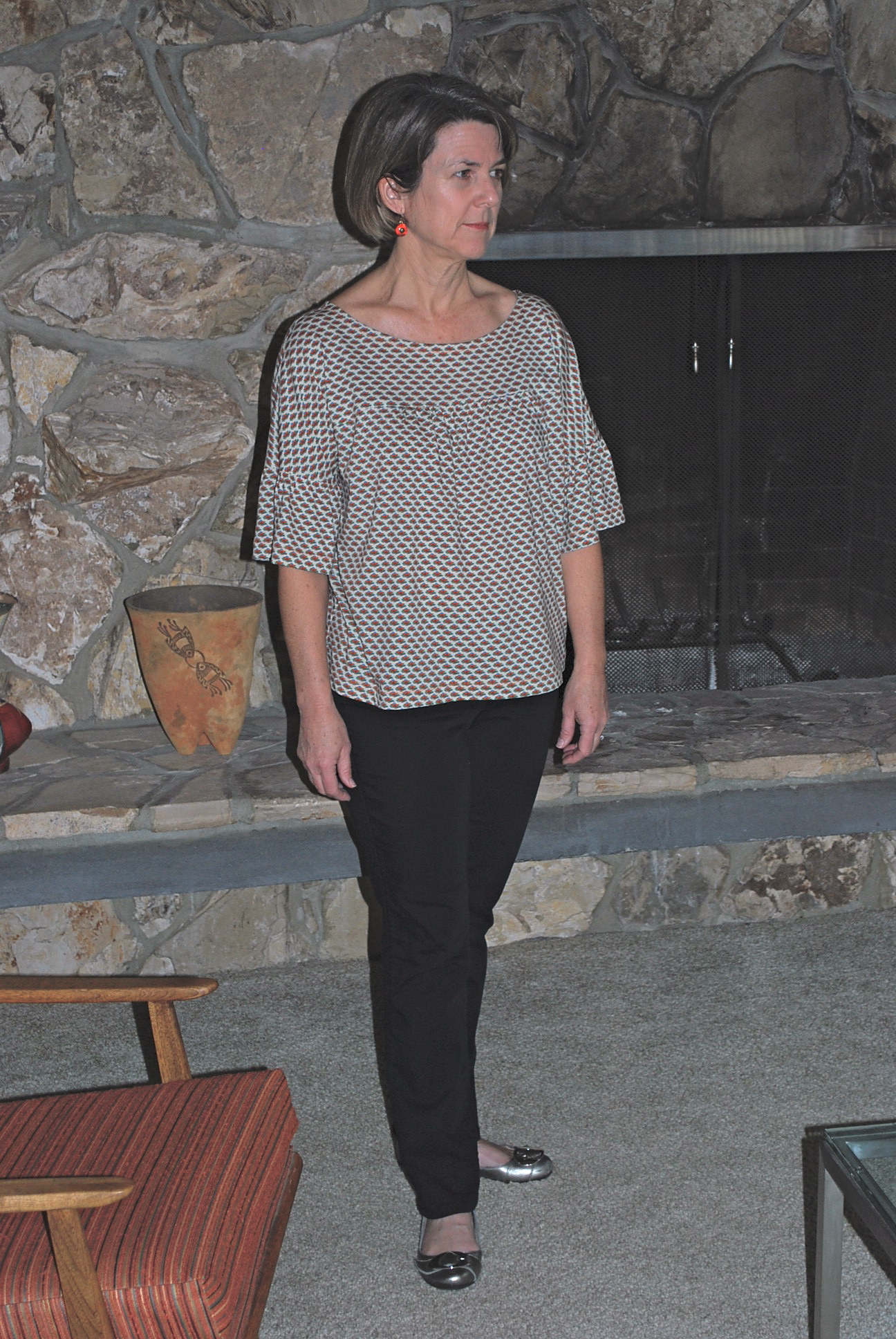 4. Don’t cut yourself in half at your widest part. One of the beauties of making your own clothes in you can adjust them to flatter you the best way possible. I turned the hem up 4″ instead of the 1 1/4″ allowed on the pattern. My widest part is my thighs and my legs are relately short, so I like my tops to end somewhere around the upper part of my hips.