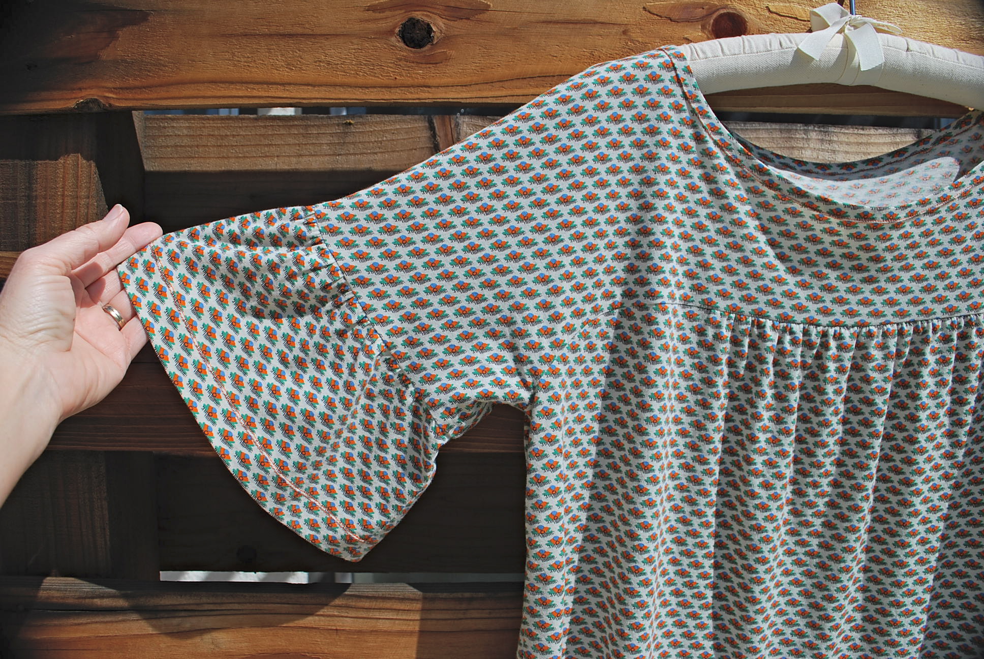 3. This fabric was 54″ instead of 60″. The patterns always give yardage amounts for 60″ and usually if the fabric is a bit narrower it doesn’t matter. In this case I was unable to fit the full length of the sleeve ruffle pattern piece on the fabric and had to settle for a ruffle that was less full. I would have liked the 3 or 4 inches I had to leave off the diameter of the ruffle.