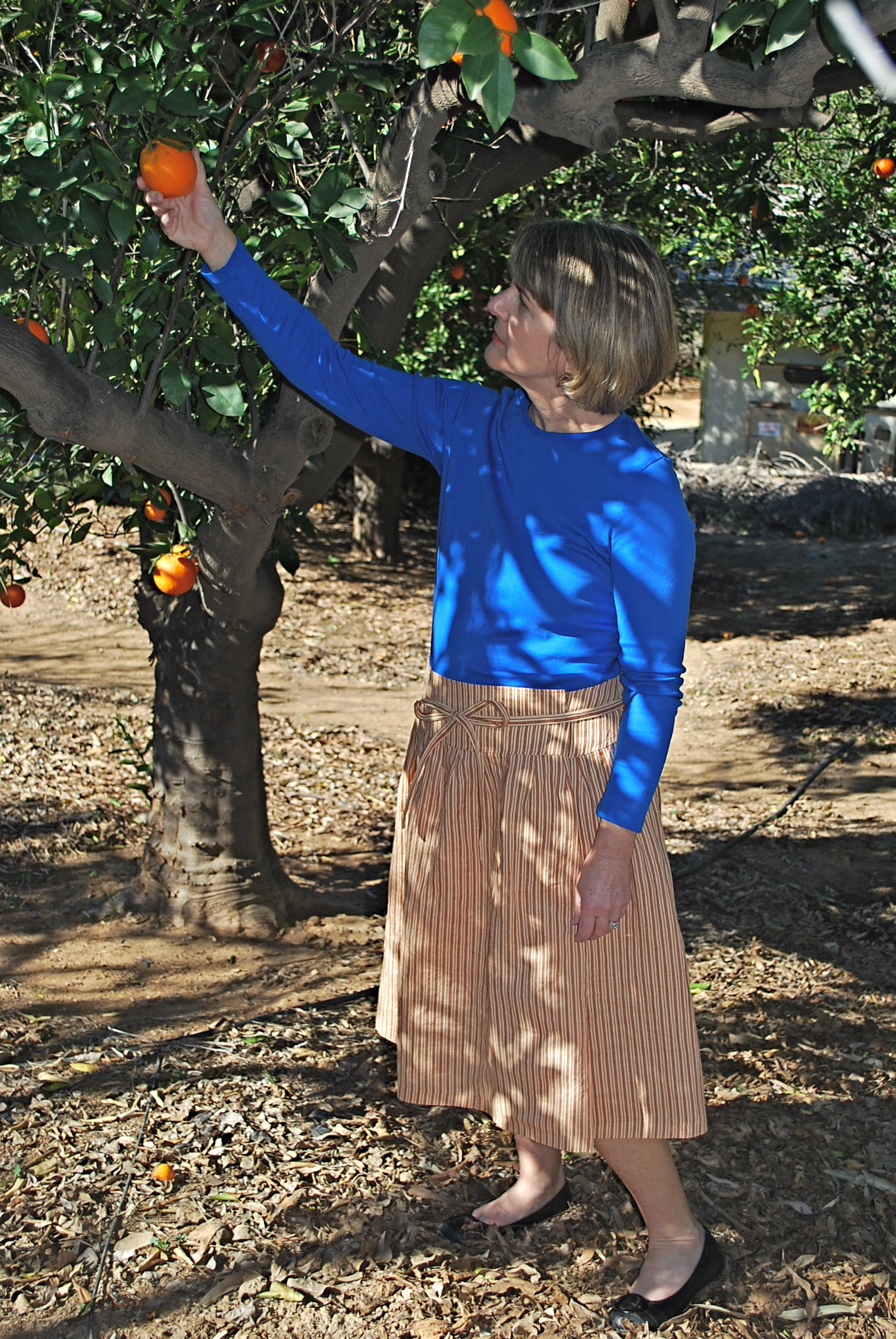 1. I made a size Large, which is a big as it comes. My fold at the yoke takes in about 4″ of slack. I am wearing it so the yoke sits slightly below the waist. Since it’s not fitted, individuals could play around with where they wear the yoke in relation to their waist and hips. If you are tall with narrow hips, I think you could probably wear it farther below the waist and it would be flattering. For a pear shape like me, it probably looks best worn higher.