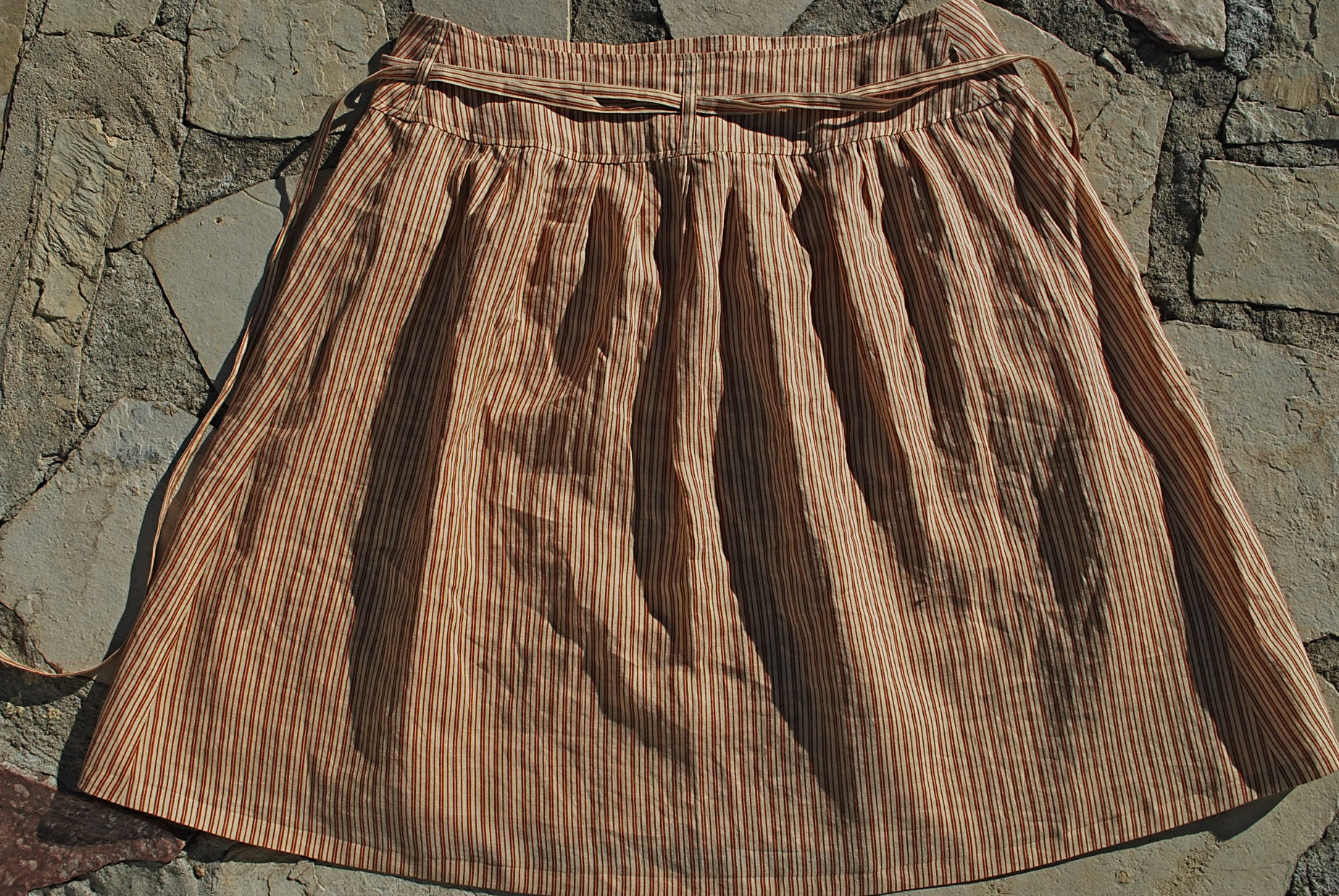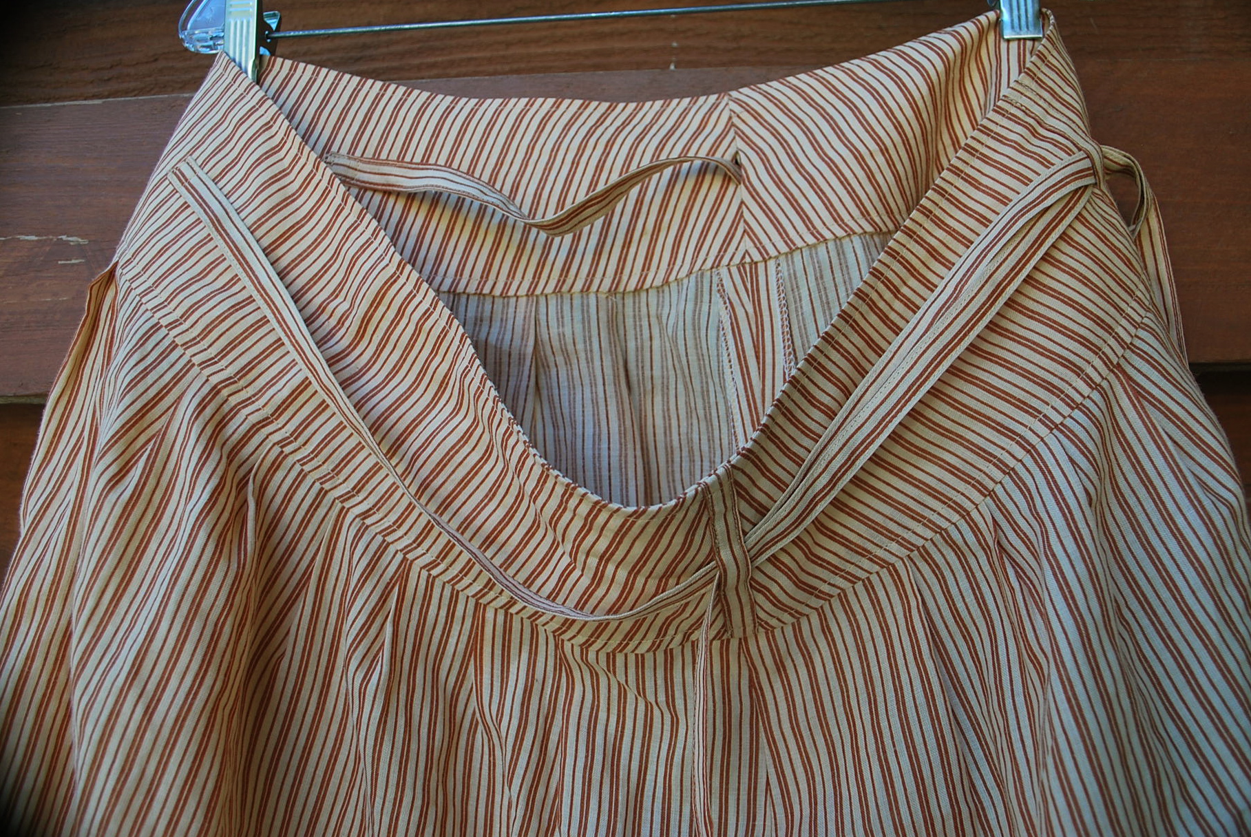 The fabric I choose is a light to medium weight Italian linen. It is once again from Michael Levine’s in downtown LA. This fabric is 58″ wide, and I bought 2 yards at $18 per yard. I selected this fabric because I was drawn to the colors, and the stripes make it a bit more interesting than a solid. DSC_0521Even though the skirt has the word “wrap” in the title, it is really a tube. I believe the designer uses the term wrap because because you fit the skirt to your body by taking a fold in the yoke and then securing it with the ties.
