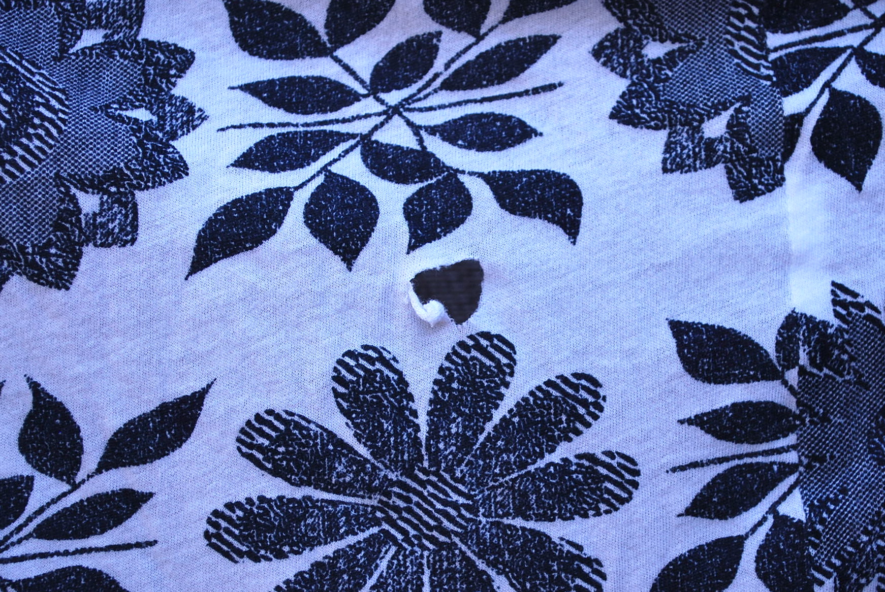 The instructions called for finishing the armhole by turning under the raw edge of the fabric 5/8″ and doing a narrow hem. I thought this would be almost impossible at the curve of the underarm. I finished the armholes with purchased bias tape instead.
